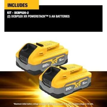 Show moreIntroducing the DEWALT 20V MAX XR POWERSTACK 5 Ah Lithium Ion Battery, 2-Pack (DCBP520-2), a revolutionary solution for professionals and DIY enthusiasts alike. This power-packed battery is designed to elevate your performance on the job site, offering 50% more power compared to standard batteries, making it DEWALT's most efficient battery in its class. Whether you’re drilling, cutting, or using a variety of power tools, expect superior efficiency and reliability with this robust battery system.