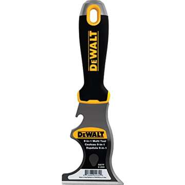 Show more Introducing the DEWALT 9-in-1 Multi-Tool, where durability meets versatility! This professional-grade tool features a hardened, high-carbon steel blade designed for all your heavy-duty household and professional needs. With various functions including a curved scraper, straight scraper, gauger, screwdriver, roller cleaner, nail puller, can and bottle openers, and an alloy metal hammer end, it is perfect for DIY enthusiasts and professionals alike. The lightweight nylon handle is not only impact and solvent resistant but also ergonomically designed to minimize fatigue during prolonged use, making it the ideal companion for all-day projects.