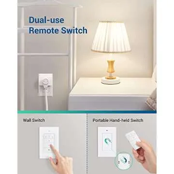 Show moreDiscover the ultimate in home convenience with the DEWENWILS Remote Control Outlet, a versatile dual-use remote switch designed to simplify your life. This innovative product combines the functionality of a remote wall switch with that of a handheld remote, empowering you to control your household appliances effortlessly from anywhere in your room. Imagine being able to turn on your lamps, fans, or holiday lights without ever having to get up. The detachable magnetic control adds another layer of convenience, allowing you to take the control right where you need it in your home.