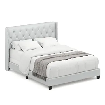 Show moreIndulge in the elegance and comfort of the DG Casa Bardy Diamond Tufted Upholstered Panel Queen Bed Frame, a stunning addition to your bedroom that seamlessly marries luxury and practicality. Crafted from high-quality white faux leather, this exquisite bed frame features a beautifully tufted diamond headboard with chic nailhead trim, providing not only a visual focal point but also a cozy resting place for your head while you unwind after a long day. Built with solid wood construction, this bed frame ensures durability and stability, making it a reliable choice for your nightly retreat.
