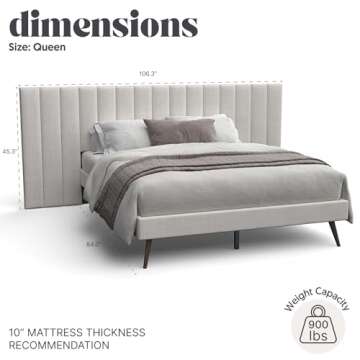 DG Casa Rhodes Queen Bed Frame with Extended Headboard, Timeless Beige Fabric, Splayed Wood Legs, Solid Wood Legs, Wood Slat Support, Chic Tan Headboard, Modern, Beige