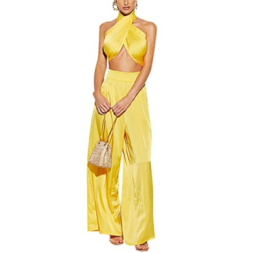 Dgebou Summer Elegant Two Piece Outfits for Women, Sexy Halter Criss Cross Crop Tops and Wide Leg Pants Sets Shiny Clubwear