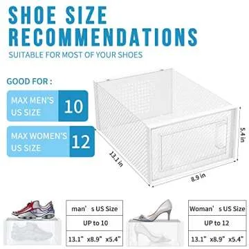 Each box has been expertly crafted from durable PP & ABS plastic, ensuring both sturdiness and breathability. With strategically placed ventilated holes, these boxes promote air circulation, preventing odors and keeping your shoes fresh. Whether you're storing heels, flats, sneakers, or even sandals, the generous size (13.1 x 9 x 5.5 inches) accommodates shoes up to US size 10 comfortably, making them versatile for every footwear enthusiast.