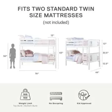 DHP Dylan Convertible Wood Bunk Bed, Stackable and Detachable Bed Frames for Kids and Teens, with Ladder, High Guardrail, Wood Slats, No Boxspring Required, Twin-Over-Twin, White