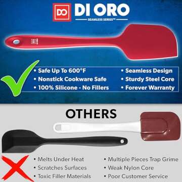 While many kitchen tools might fall short in terms of durability and performance, DI ORO’s Seamless Series stands out for its construction and customer care commitment. Many competitor spatulas are often made of flimsy materials or have multiple pieces that can fall apart. The DI ORO spatulas are built as one seamless piece, ensuring longevity and superior performance. Alongside their Forever Promise, where customers receive replacements for damaged items at no cost, it’s clear they prioritize customer satisfaction like no other brand.