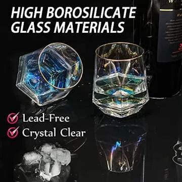 Show more Discover the exquisite Diamond Whiskey Glasses, a stunning set of four rainbow-colored cocktail glasses that redefine drinking. Featuring a unique diamond shape and elegant gold-banded rims, these glasses elevate every sip, making them more than just drinkware but a symbol of sophistication. Perfectly crafted for whiskey, scotch, bourbon, or even wine, these tumblers will leave an unforgettable impression on anyone who enjoys a good drink. With a focus on both aesthetics and function, these glasses ensure every occasion is celebrated in style.