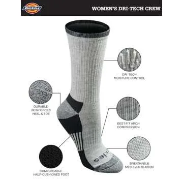 Show moreIntroducing the Dickies Women's Dri-Tech Essential Moisture Control Crew Socks, your ultimate solution for all-day comfort and dryness. Designed specifically for active women, these socks boast advanced moisture-wicking fibers that keep your feet remarkably dry while you hustle through your day. With engineered ventilation channels expertly crafted for optimal air circulation and moisture control, these crew socks ensure that your feet stay fresh and comfortable, no matter the activity. Available in sizes S through XL, these socks cater to various foot sizes and are presented in a handy assortment of styles, including six pairs in attractive grey hues.