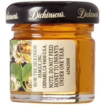 Show moreIndulge in the natural sweetness of Dickinson's Pure Honey, the perfect companion for your daily adventures! This pack of 72 comes with 1.1-ounce portion control cups that make it incredibly convenient to carry honey wherever you go. Whether you’re adding a dollop to your tea, drizzling it over your favorite snack, or using it for cooking, Dickinson's honey is a wholesome and delicious choice that enhances every meal. Made from 100% Grade A honey, this product contains no additives, ensuring that you're enjoying nature's goodness straight from the hive. Perfectly kosher and with zero trans fat, each cup is sealed for freshness, offering just the right amount to satisfy your sweet cravings without any hassle.