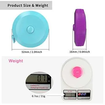 Show more The DiCUNO 60-Inch Soft and Retractable Tape is an essential tool for both sewing enthusiasts and diet-conscious individuals. This set includes three unique colors: Purple, Sky-Blue, and Cherry-Pink, providing a vibrant touch to your crafting tools. With a measurement range that covers up to 1.5 meters (60 inches), it features dual measurements of 0-150 cm and 0-60 inches, making it versatile for diverse applications. The tapes are precisely printed for easy reading, ensuring you get accurate measurements every time, whether you're tailoring clothes or tracking your fitness goals.