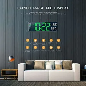 Digital Clock, Digital Wall Clock for Living Room Decor, Desk Alarm Clock for Bedroom, Large Wall Clock with Remote Control, Automatic Brightness Dimmer LED Clock with Date Temperature Week (Green-W)