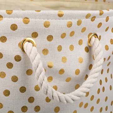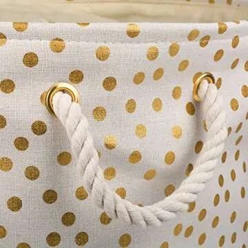Show more Introducing the DII Polyester Storage Bin from the Gold Metallic Collection, a chic and practical solution for all your storage needs! With a size of 16x15 inches, this collapsible storage bin is designed with an innovative O-ring and a cardboard bottom to reinforce its shape and provide exceptional structure. Whether you're looking to declutter your home or add stylish organization to your space, this bin stands out with its elegant natural off-white color complemented by a stunning gold metallic finish, making it a perfect fit for any decor.