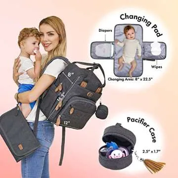 Show more Introducing the Dikaslon Diaper Bag Backpack, the ultimate solution for modern parents looking for a perfect blend of style, versatility, and functionality. This all-in-one diaper bag is designed to cater to all your needs, boasting a large capacity that measures 16.5'' x 8'' x 12''. It comes equipped with an array of thoughtful features, including a portable changing pad, stroller straps, a pacifier case, and meticulously designed pockets for your convenience. No more fumbling around for essential items; with 18 pockets strategically placed, this bag ensures you can pack, grab, and go in no time.
