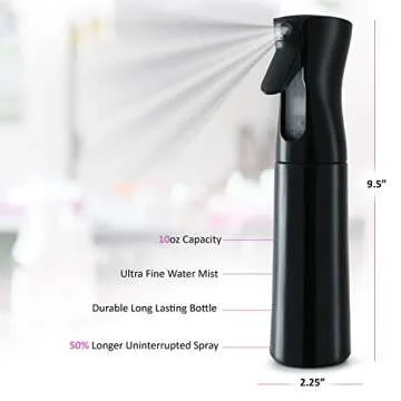 Show more Introducing the DilaBee Continuous Mist Empty Black Spray Bottle, a must-have for anyone seeking salon-quality results in the comfort of their own home. This sleek, black 10 oz spray bottle is designed for versatility, enabling a fine mist application that’s perfect for hair treatments, gardening, and artistic projects alike. Its unique 360-degree spraying technology offers a continuous, even mist from any angle, ensuring no spot is missed. Constructed with BPA-free materials, it is not only safe for you but also environmentally conscious.