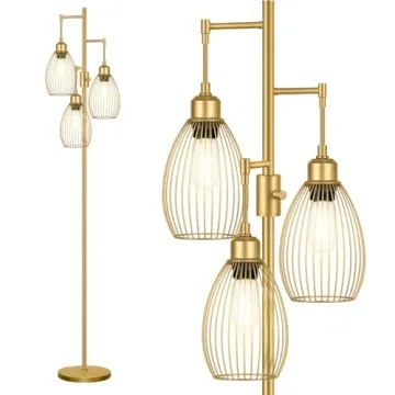 Introducing the **Dimmable Floor Lamp**, a striking blend of modern aesthetics and functional excellence that revolutionizes your home lighting experience. Standing tall at an impressive 70 inches, this industrial-style floor lamp serves well throughout your living spaces, creating an inviting warmth in your *living room*, *bedroom*, *office*, or *dining room*. Designed with a sleek **gold finish** and an elegant **teardrop cage head** that holds warm **Edison bulbs**, this piece not only provides illumination...