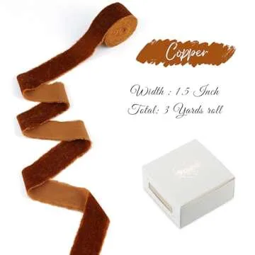 Show more This exquisite copper velvet ribbon redefines elegance, adding a sophisticated touch to your gifting needs and creative projects. Hand dyed to achieve its unique caramel hue, this ribbon boasts a soft, shiny luster that captures the eye and compliments the rustic farmhouse aesthetic. Measuring a generous 1.5 inches wide and 3 yards long, it’s perfect for enhancing bouquets, wrapping gifts, and decorating for special occasions.