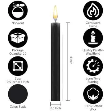 black candles, each measuring 4 inches tall and 1/2 inch wide,