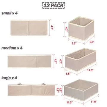 Show moreIntroducing the **DIOMMELL 12 Pack Foldable Cloth Storage Box**, your ultimate solution for decluttering and organizing personal items with style and functionality. This thoughtfully designed set includes 12 sturdy yet attractive fabric bins in three different sizes—large, medium, and small—perfectly crafted to accommodate a variety of items like underwear, bras, socks, ties, scarves, and more. Each container is made from durable non-woven fabric and cardboard, providing a lightweight yet robust organization option that blends seamlessly into any room decor.