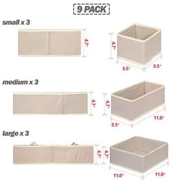 Show moreWelcome to the ultimate solution for home organization with the DIOMMELL 9 Pack Foldable Cloth Storage Box. Designed to simplify your life, these versatile storage bins are perfect for categorizing and storing a variety of items, from baby clothes to personal accessories. Each set includes three sizes of organizer bins: 3 large square bins, 3 medium rectangular bins, and 3 small square bins. With dimensions tailored for ultimate functionality, they fit seamlessly into any drawer or closet space.