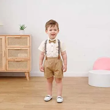 Show moreIntroducing the **DISAUR Baby Boy Clothes Suits**, a charming and versatile outfit designed for your little gentleman aged 1-5 years. This exquisite ensemble combines a classic short-sleeved shirt and elegant suspender pants, perfectly crafted to make your baby boy the star of any special occasion. Whether it’s a wedding, a christening, or a family celebration, this outfit will ensure he looks smart and stylish. The warm beige color is not only trendy but also easy to pair with a variety of accessories, making dressing up hassle-free. Crafted with soft, high-quality materials, each piece is gentle on delicate skin while providing comfort throughout the day, so you can capture those precious moments without worrying about discomfort.