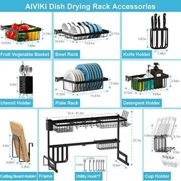 Show more Transform your kitchen space with the ultimate Dish Drying Rack Over The Sink! Designed for modern homes, this adjustable drying rack not only enhances functionality but also elevates the style of your kitchen. Featuring a unique multi-functional setup, it includes everything you need to keep dishes organized: a dish rack, bowl rack, fruit basket, knife holder, utensils holder, cutting board holder, cup rack, and even 7 utility hooks! Made from durable stainless steel with a sleek black baking finish, this rack promises longevity and easy cleaning, turning your sink area into a neat, dry, and functional workspace.