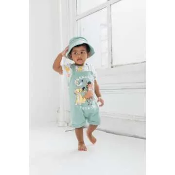 Show more Introduce your little one to the magical world of Disney with the Disney Lion King 3 Piece Outfit featuring Simba, Timon, and Pumbaa! This officially licensed set includes adorable shortall overall shorts, a charming graphic tee shirt, and a matching cap. Perfectly designed for infants aged 0-24 months, this outfit combines comfort and playful style effortlessly. The vibrant all-over print design showcases your baby's favorite characters, ensuring they look cute while feeling cozy during their adventures.