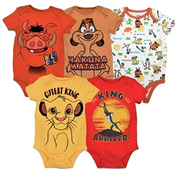 Show more Discover the magic of childhood with the Disney Baby 5 Pack Bodysuits, featuring your little one's favorite characters like Mickey Mouse, The Lion King, Winnie the Pooh, Pixar's Toy Story, and Finding Nemo. Perfect for newborns to infants, these officially licensed bodysuits showcase a delightful mix of colors and playful prints, inspiring smiles while providing unmatched comfort. Crafted from a soft cotton blend, this collection ensures sensitive skin is cared for, making every wear a pleasant experience.