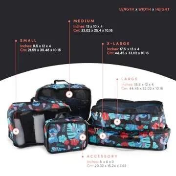 Constructed with the highest quality materials, these compression cubes optimize packing by allowing you to fit more into less space. The set includes a large compression cube (13" x 18" x 5.5"), a medium organizer (12" x 16" x 5.5"), a small packaging cube (11" x 13" x 5.5"), and a flat pouch (6" x 10") for documents, making organization easy and intuitive. From colorful Disney-themed accents to transparent mesh panels for quick visibility of your essentials, each cube is tailor-made to meet the demands of every traveler, no matter their age.
