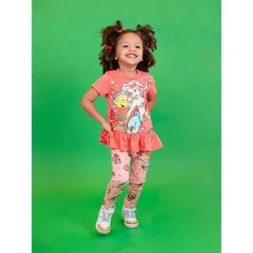 The delightful screen print design showcases beloved characters infused with sparkly glitter that transforms any outfit into a magical experience. Expertly crafted from soft and durable fabrics, this set is tailored for the active little girl who craves adventures. Thanks to the thoughtfully designed elastic waist on the leggings, parents will find dressing a breeze, and little ones will appreciate the snug yet comfortable fit. No need to worry about wear and tear—this set has proven to hold up remarkably after countless washes, without losing its charm or shape.