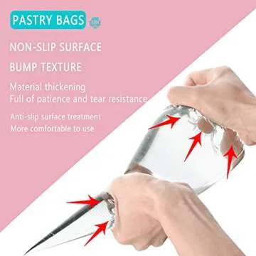 Show more Introducing our innovative tipless piping bags, the essential tool for anyone who loves baking and decorating cakes! Crafted from high-quality, food-grade PE material, these bags are made to withstand the pressure of icing and filling without bursting, ensuring you can put your culinary skills on full display. With a robust design and anti-skid points, you can hold your piping bags firmly, making it easier to create beautiful decorations with precision and ease.