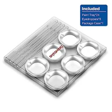 Show more Introducing the DIYESMART 24Pcs Stainless Steel Paint Palette Tray Set, your ultimate companion for all things creative! This comprehensive set includes 16 stainless steel paint trays (8 with pour spouts for precision pouring and 8 without) and 8 high-quality 3ml plastic eyedroppers. Designed specifically for artists, hobbyists, and DIY enthusiasts, this versatile suite is engineered for an array of applications including makeup artistry, paint blending, oil mixing, and pigment measuring, ensuring your creative process is both efficient and enjoyable.