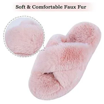 Show more Discover the ultimate in comfort and style with the Women's Crossband Soft Plush Slippers. Crafted for the modern woman, these slippers showcase a chic cross-band design combined with a soft, furry bottom, ensuring that your feet look cute and feel cozy. The open-toe design allows for breathability, making them perfect for warm weather, while the soft rabbit fur lining offers a gentle and luxurious touch that cradles your feet with every step.