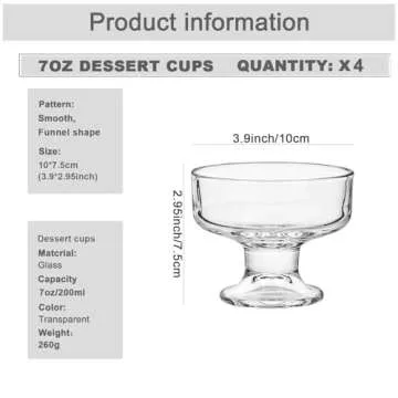 Show moreIntroducing the DNIENKGE 4 Pack Glass Ice Cream Cups, a must-have addition to your kitchen that beautifully combines style with functionality. Each sleek glass cup boasts a generous 7 oz capacity, making them perfect for serving a variety of delicious treats – from creamy ice creams and gourmet desserts to fresh fruits and mixed drinks. Crafted from high-quality glass, these dessert bowls not only enhance the presentation of your culinary creations but are also durable enough for daily use. Their elegance and versatility make them an ideal choice for both casual snack days and lavish cocktail parties.