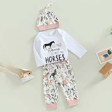 DNOMAID YZARC Western Baby Boy Girl Outfits Letters Print Long Sleeve Romper Bodysuit Cow Print Pants Hat 3Pcs Clothes Set (Pink Horse, 0-3 Months)