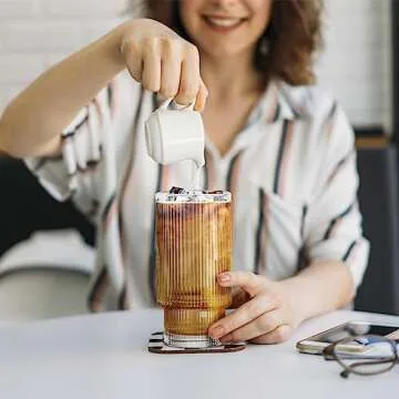 DoceMora 16oz Ribbed Glass cups with Bamboo Lids and Glass Straws Set of 4, Vintage Origami Style Clear Glassware, Reusable Drinking Glasses for Juice, Iced Coffee Beer and Cocktail