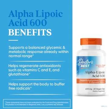 Show more Discover the remarkable benefits of Doctors Best ALA Supplement, a powerful antioxidant designed to support your health and vitality. This potent 600 MG formulation is at the forefront of dietary supplements, targeting a multitude of health concerns, including liver function and energy levels. Enriched with the goodness of Alpha-Lipoic Acid (ALA), this product is not only effective but also easily digestible, making it perfect for individuals looking to enhance their well-being without discomfort.