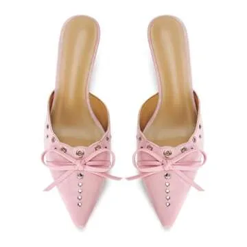 DOEYG Pink Kitten Heels for Women Pointed Toe Heels Dressy Pointy Heeled Mule Heels Bow Studded Vintage Heels Trendy Slip on Stiletto Heels Pumps Size 7.5