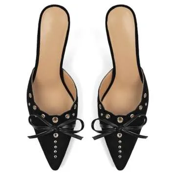 DOEYG Studded Heeled Mules for Women Suede Vintage Stiletto Heels Pointy Slip on Bow Tie Pumps Shoes Backless Mid Heels Dress Party Slide Heeled Sandals for Women