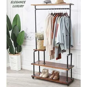 Show more This stylish clothing rack elevates any space with its contemporary industrial design while providing exceptional functionality. Crafted with high-quality materials, this rack offers superb strength and stability, capable of holding even the heaviest of items like coats and jeans. The thoughtful design includes an easy assembly feature that makes setup a breeze, perfect for those who might not be experienced in DIY projects. The elegant yet robust build gives a rustic charm to your home, making it a perfect addition to your living room, bedroom, or den.