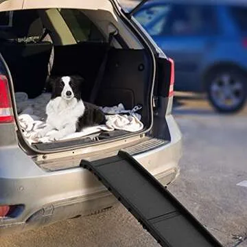 Show more This amazing NONSLIP PET RAMP FOR CARS revolutionizes the way your furry friend gets in and out of vehicles! Designed for convenience and safety, this 61-inch-long ramp features a sturdy nonslip walking surface that ensures your pet has the secure footing they need. Whether it's jumping into your truck, SUV, or RV, your beloved dog can navigate their way effortlessly and confidently. The carefully crafted raised side rails prevent any accidental slips or falls, giving you peace of mind every time you travel.