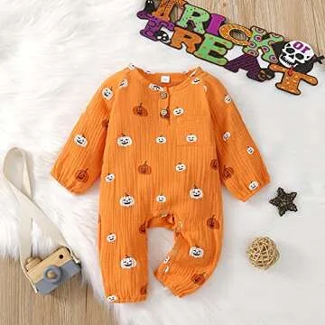 Doisbetthsay Newborn Baby Halloween Romper Pumpkin Print Sweatshirt Jumpsuit Zip Up Bodysuit Fall Winter Baby Girl Boy Clothes (6-12 Months,B Orange)