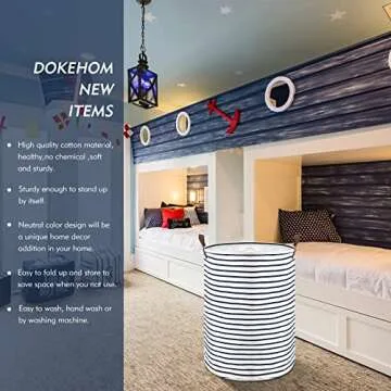 DOKEHOM 17.7-Inches Freestanding Laundry Basket with Lid, Collapsible Large Drawstring Clothes Hamper Storage with Leather Handle (Blue Stripe, M)