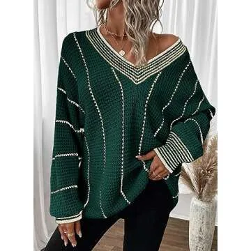 Dokotoo Oversized Sweaters for Women Cute V Neck Long Sleeve Knitted Striped Sweater Autumn Color Block Jumpers Tops Green X-Large