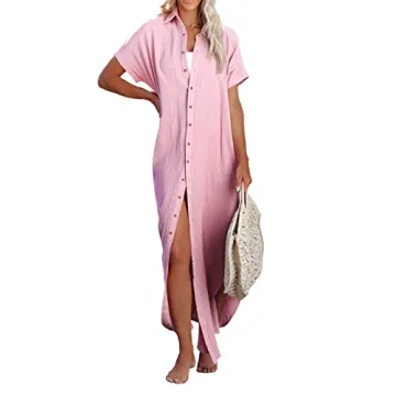 Dokotoo Swimsuit Coverups Summer Dresses for Women 2024 Vacation Button Down Long Kimonos Cardigan Beach Short Sleeve Side Split Casual Solid Loose Bathing Suit Cover Ups for Swimwear Pink L