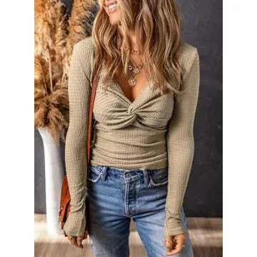 Dokotoo V Neck T Shirts for Women - Trendy Fitted Long Sleeve Tops
