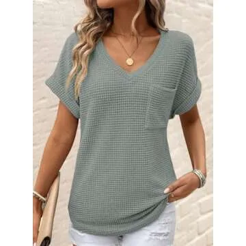 Show more Introducing the Dokotoo Waffle Knit Tops for Women – the ultimate blend of style and comfort for your wardrobe! These fashionable short sleeve shirts have been designed for women who appreciate quality and versatility. Made from lightweight and soft materials, these tees are not only smooth and breathable but also stretchy enough to provide a snug yet comfortable fit. The v-neck design and rolled sleeves not only enhance your elegance but offer a perfect balance between casual and chic. Whether you're dressing up for a special occasion or keeping it casual, these tops are your new go-to choice!