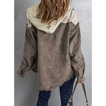 Dokotoo Winter Fall 2024 Coats for Women Fashion Casual Long Sleeve Flannel Shirts Contrast Color Block Oversized Button Down Hooded Fleece Corduroy Shacket Jackets with Pockets Brown Medium