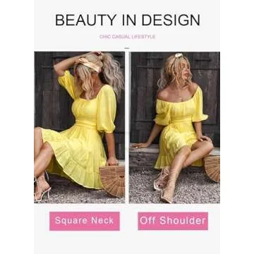 Show moreStep into the sunny season with the Dokotoo Women's Square Neck Yellow Dress! This enchanting summer essential captures the essence of carefree elegance and vibrant style. Made from high-quality, soft material, this dress promises a fluffy and warm experience without compromising on comfort. Its classic square collar paired with trendy lantern sleeves not only gives it a retro flair but also allows you to wear it in two fabulous ways: on or off the shoulder. The tie-back feature, complete with a self-tie bowknot, accentuates your silhouette beautifully, while the shirred elastic waist ensures a perfect fit that flatters various body shapes. Designed with an above-knee length and a pretty ruffle hemline, this dress gives just the right amount of sass, making it ideal for any summer occasion.