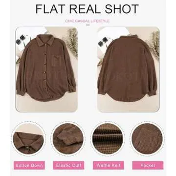 Dokotoo Women Waffle Knit Shirts Long Sleeve Plus Size Blouses Lightweight Collared V Neck Tops Solid Button Up Blouses Casual Fashion Spring Cardigan Brown Medium