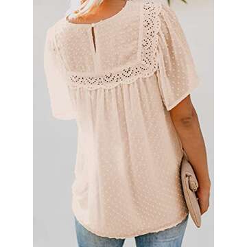 Dokotoo Womens 2024 Stylish Spring Summer Front Lace Crochet Panel Pom Pom Strappy Crew Neck Short Sleeve Shirts Soft Cute Solid Basic Blouses Tops Apricot XL