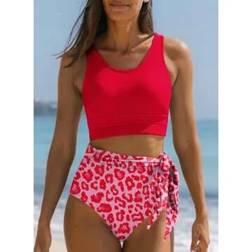 Dokotoo Womens Bikini Sets Fashion Leopard Print Scoop Neck Cutout 2024 Racerback 2 Piece Swimsuit Tie Knot Tummy Control High Waisted Bathing Suits Red Small